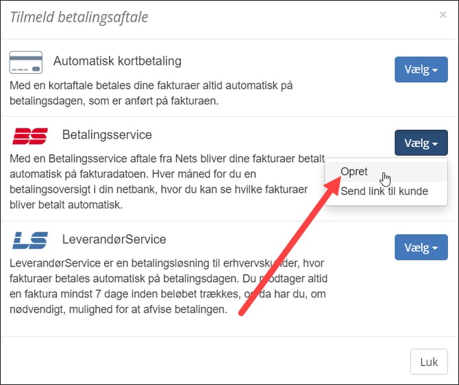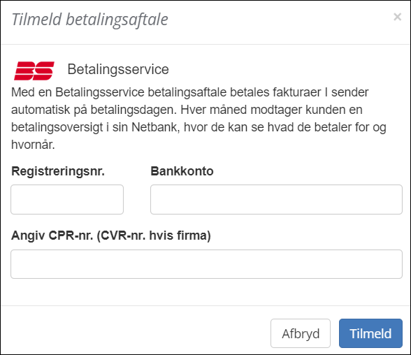 - Når du vælger den betalingsløsning aftalen skal knyttes til, i dette eksempel Betalingsservice, ser du om du selv kan indtaste de påkrævede oplysninger for at tilmelde betalingsaftalen, eller om du skal sende et tilmeldingslink via e-mail til kunden, som så selv indtaster oplysningerne.