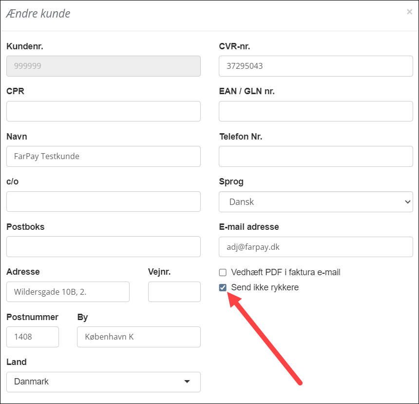 Du kan markere en enkelt kunde til ikke at modtage rykkere.