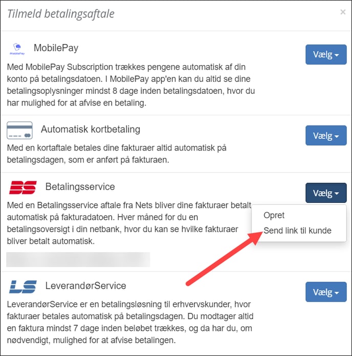 - I dette eksempel vises en Betalingsservice tilmelding, men samme procedure er gældende for alle betalingsløsninger du har tilvalgt hos FarPay. Tryk på knappen "Vælg", og "Send link til kunde".